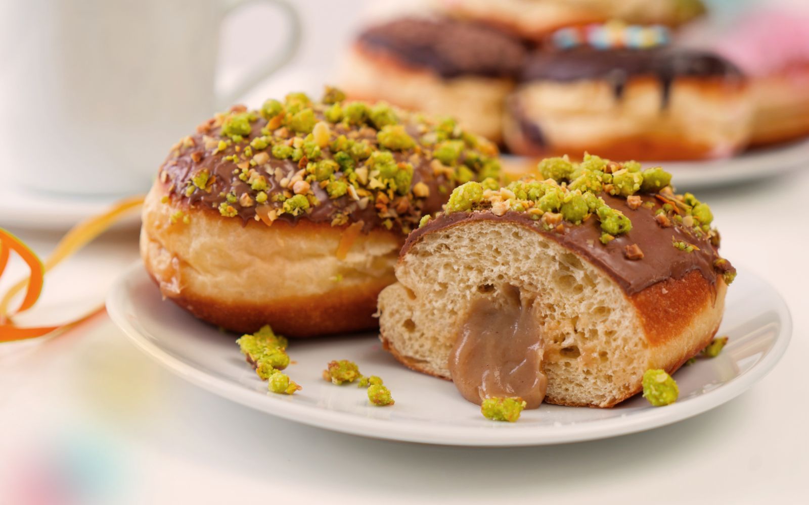 Ein Hochgenuss für Feinschmecker. Die hausgemachte Nougat-Pistazie Füllung schmeckt unvergleichlich lecker. Ihre Konsistenz ist cremig-nussig wie eine Pralinenfüllung. Der hausgemachte Krapfenteig wird mit frischen Eiern und Milch hergestellt. Die Belgische Schokolade rundet den Geschmack vom Pistazie -Nougat Krapfen ab und schafft ein besonderes Genusserlebnis. Zarter Biss, cremige Füllung und ein fluffiger Krapfenteig, das ist echter Schmidtgenuss in jedem Detail.