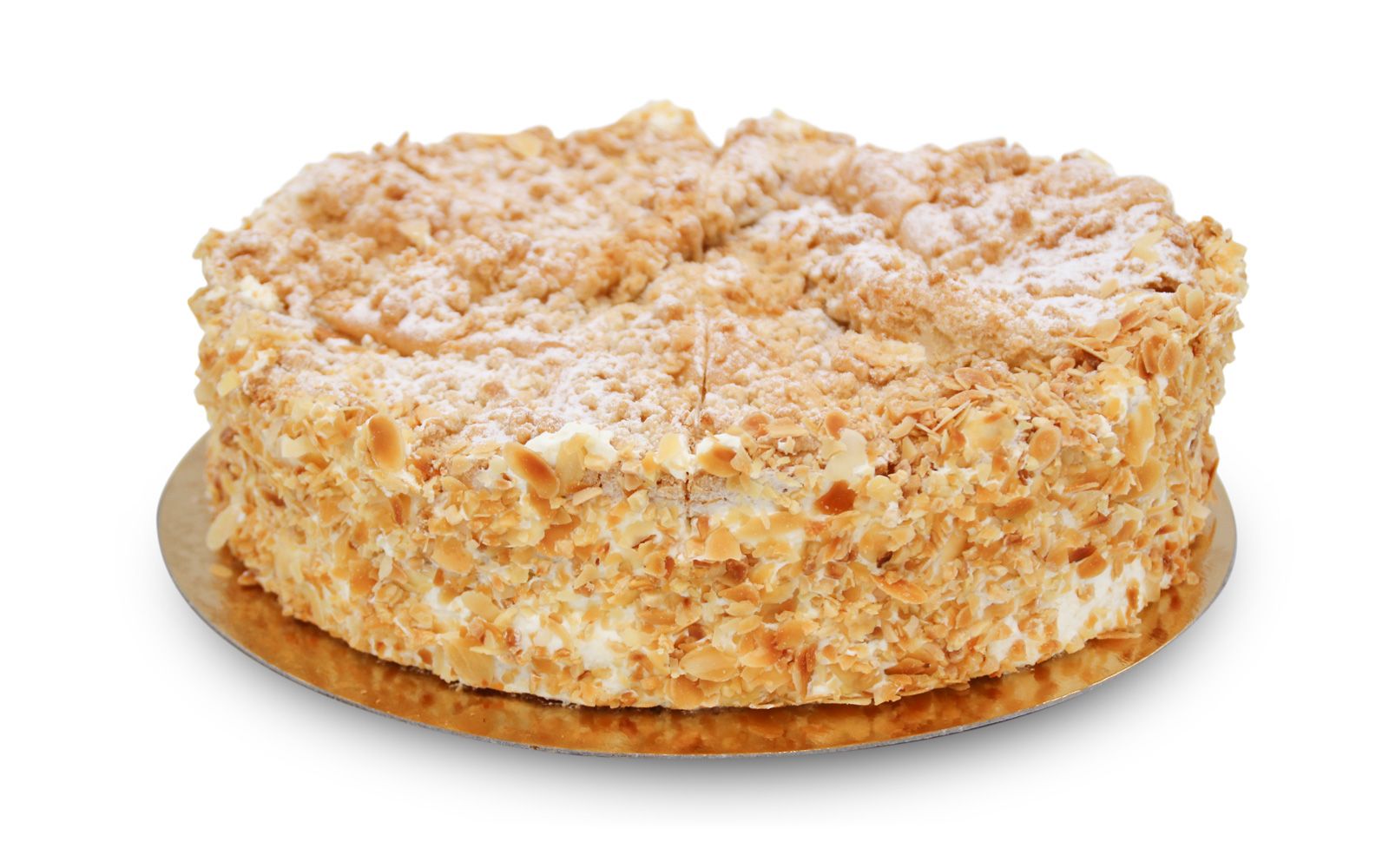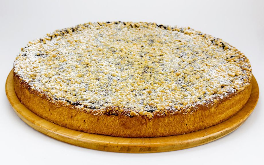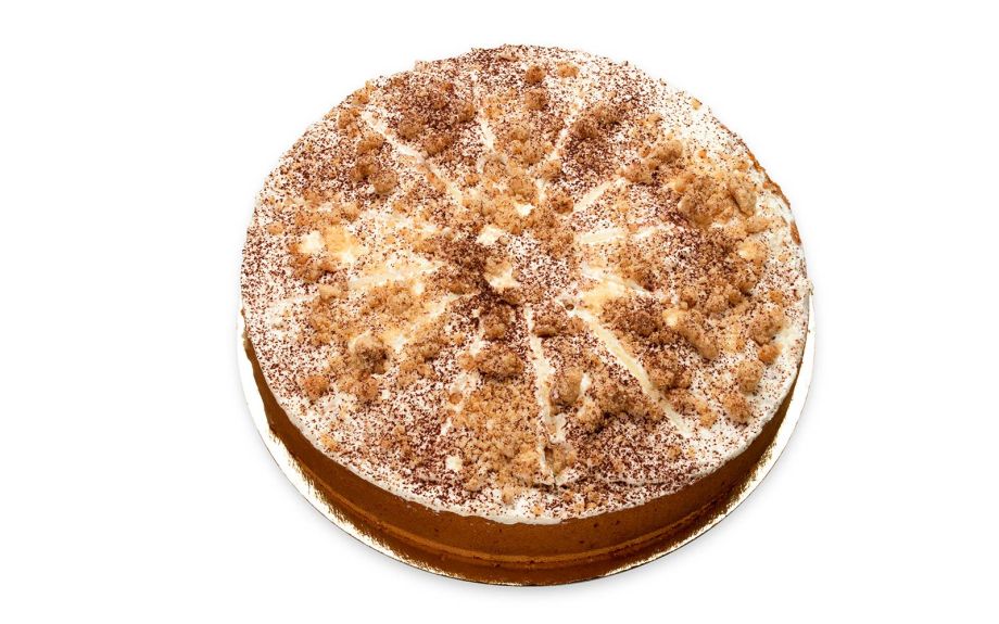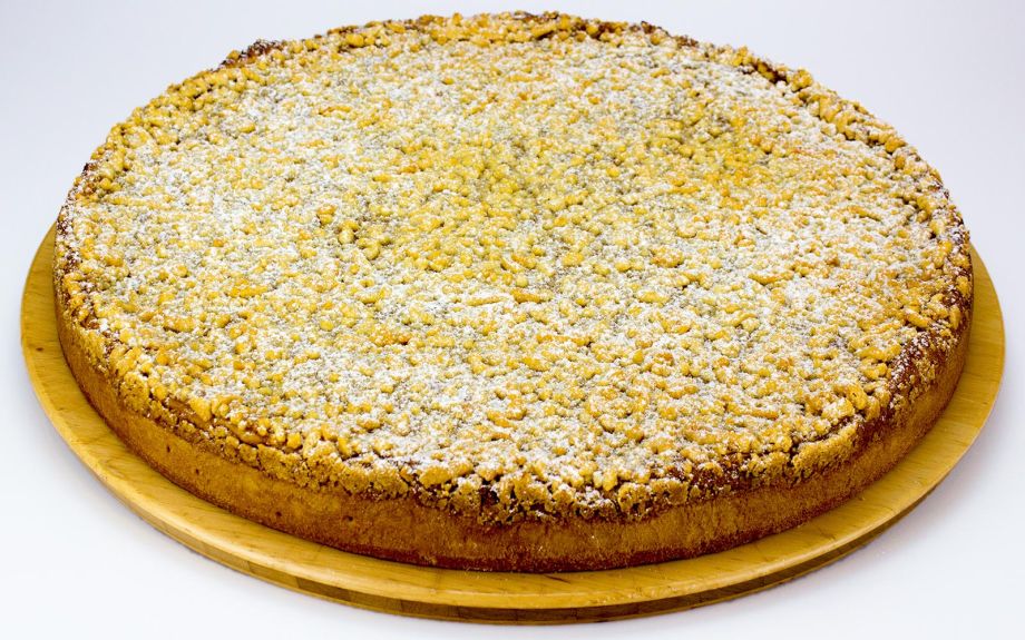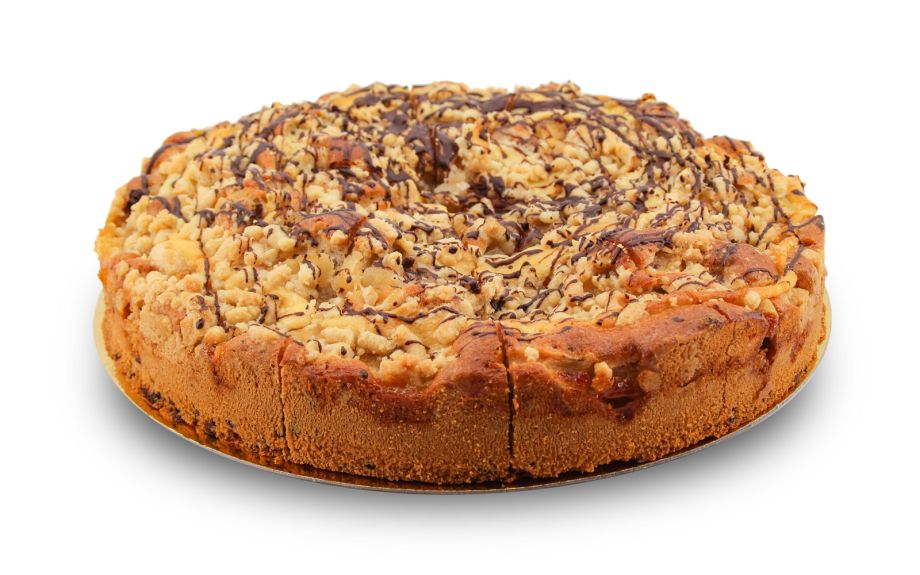 Mürbeteigboden gefüllt mit frischen Äpfeln, Vanillesahne und gebackenen Zimtstreuseln dekoriert.