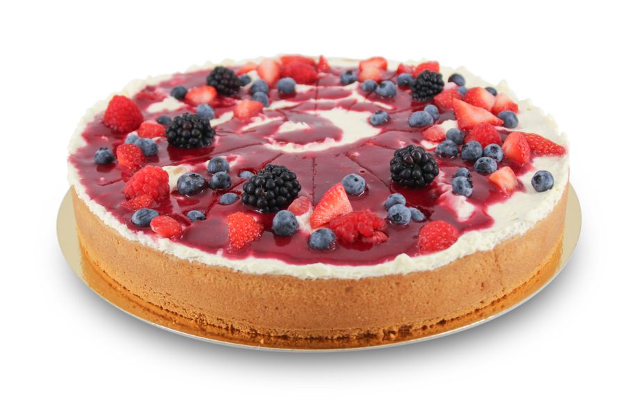 Quarkschmandkuchen mit Vanillesahne, mit fruchtigem Waldbeerspiegel und frischen Beeren.