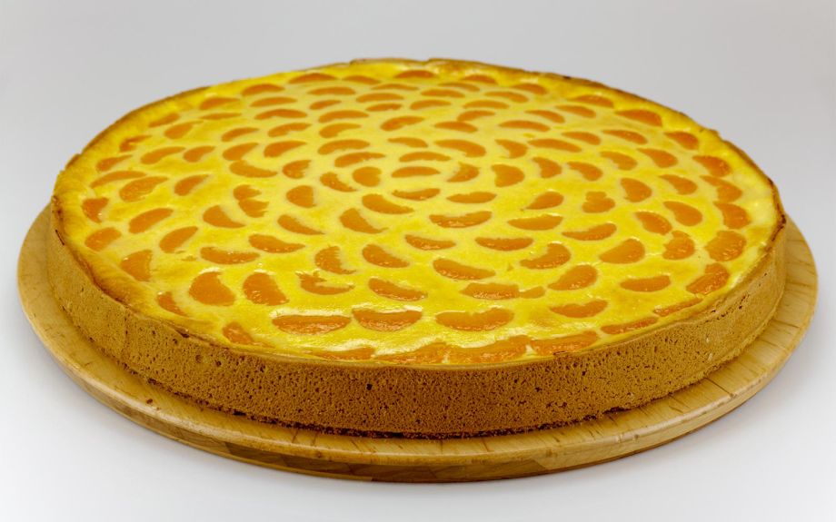 Quarkschmandkuchen mit Vanillesahne, mit fruchtigem Marillenspiegel und Marillenstücken.