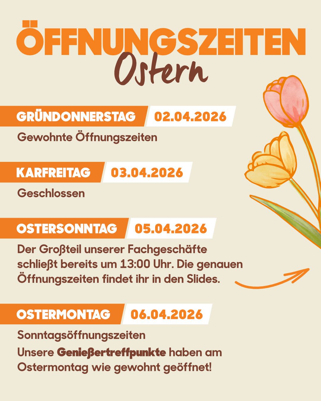 Deshalb schließen wir am Ostersonntag, den 05.04.26, den Großteil unserer Fachgeschäfte bereits um 13:00 Uhr.