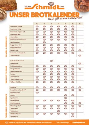 Entdecken Sie unseren Brotkalender und laden Sie das PDF herunter! Genießen Sie jeden Tag die Vielfalt unserer natürlichen Backwaren.