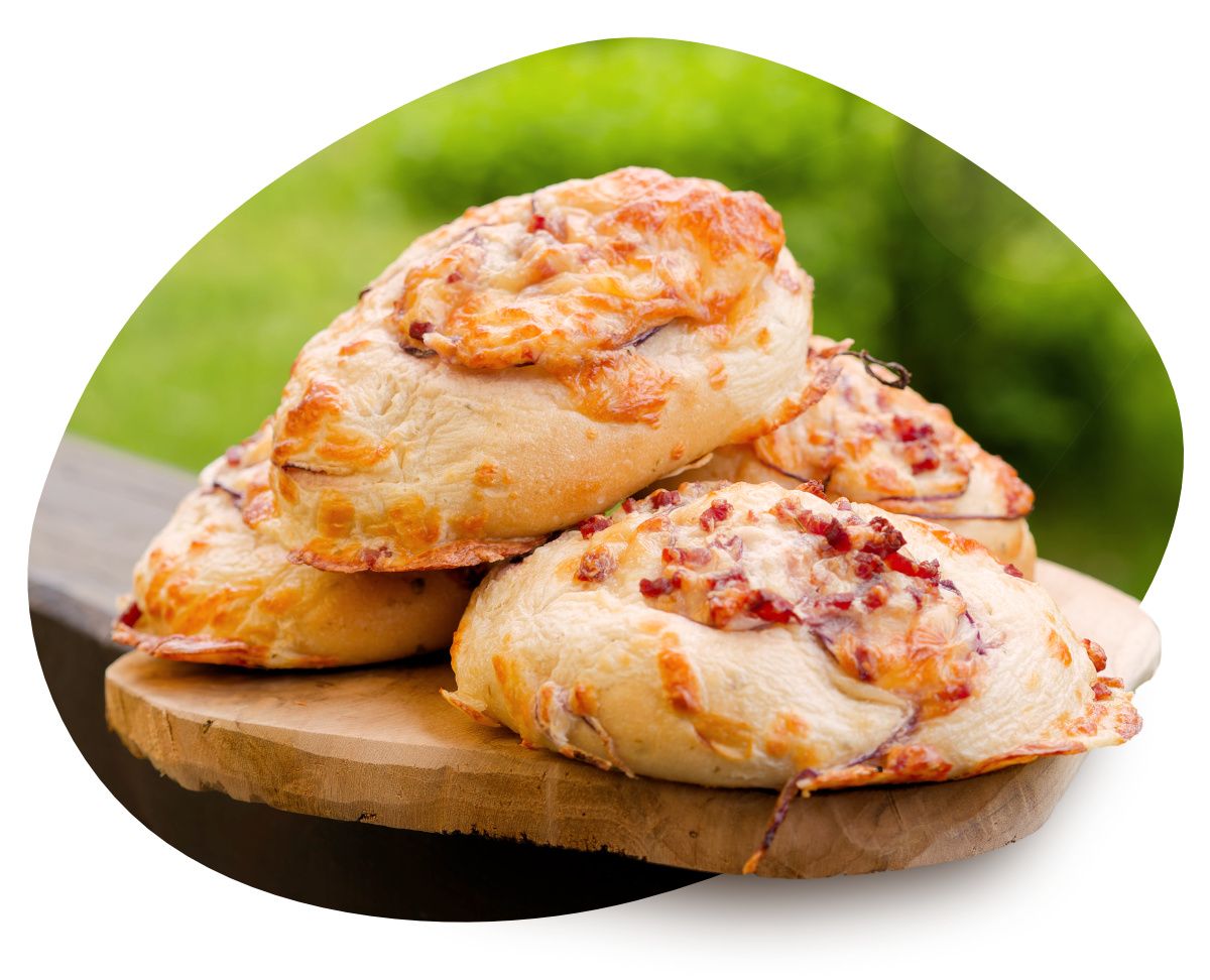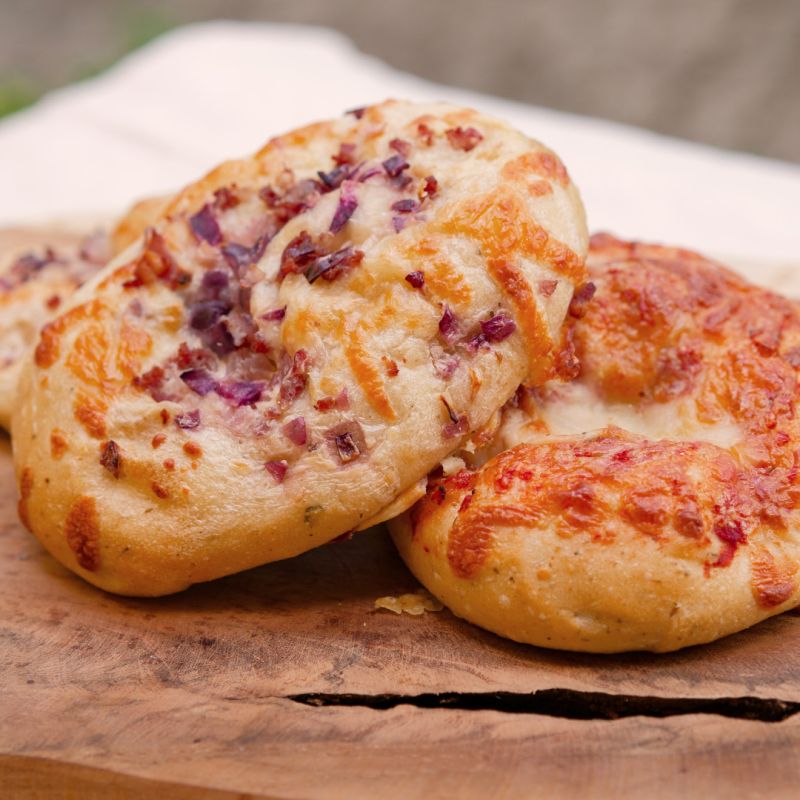 Die Geschmacksrichtung vom Elsässer war einfach noch ein Anliegen von mir. Ich wollte hier ein bisschen in die Gourmet-Richtung gehen, vielleicht auch etwas in die Sterneküche. Beim Elsässer mit seinem Speck und Schmand und ein bisschen roter Zwiebel, die auch noch schöne Farbakzente setzt, kommt man mit dem Genuss eben etwas in die höhere Schiene.